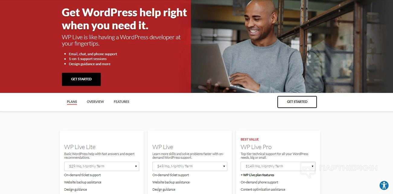 При желании можно приобрести услугу WP Live – поддержку профессионального разработчика, доступного для консультации 24/7. В услуги поддержки входит помощь в настройке, изменение кода, помощь с созданием бэкапов и восстановлением сайта, SEO-оптимизация контента или всего сайта. Стоимость услуги начинается от $29 в месяц.