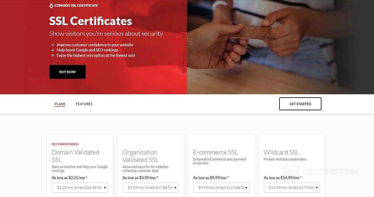 - Domain Validated SSL, от $2.25 в месяц. Базовая защита, которая обеспечивает доверие со стороны Google и Яндекс. Предоставляет страховку на $1 000, отметку о защите пользовательских данных, помогает улучшить рейтинг в поиске Google и размещает на сайте уведомление о защите TrustLogo.