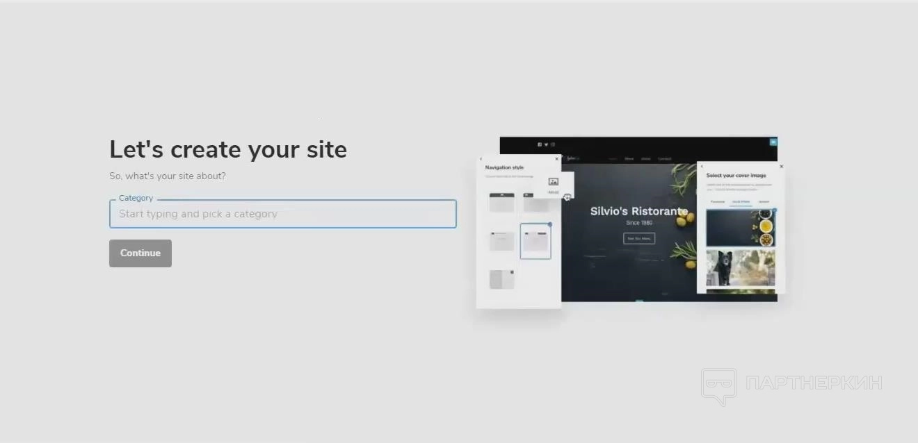 Первым шагом становится выбор тематики сайта. На стартовой странице укажите нужную тематику в поисковой строке, выберите подходящий вариант из списка и нажмите Continue .