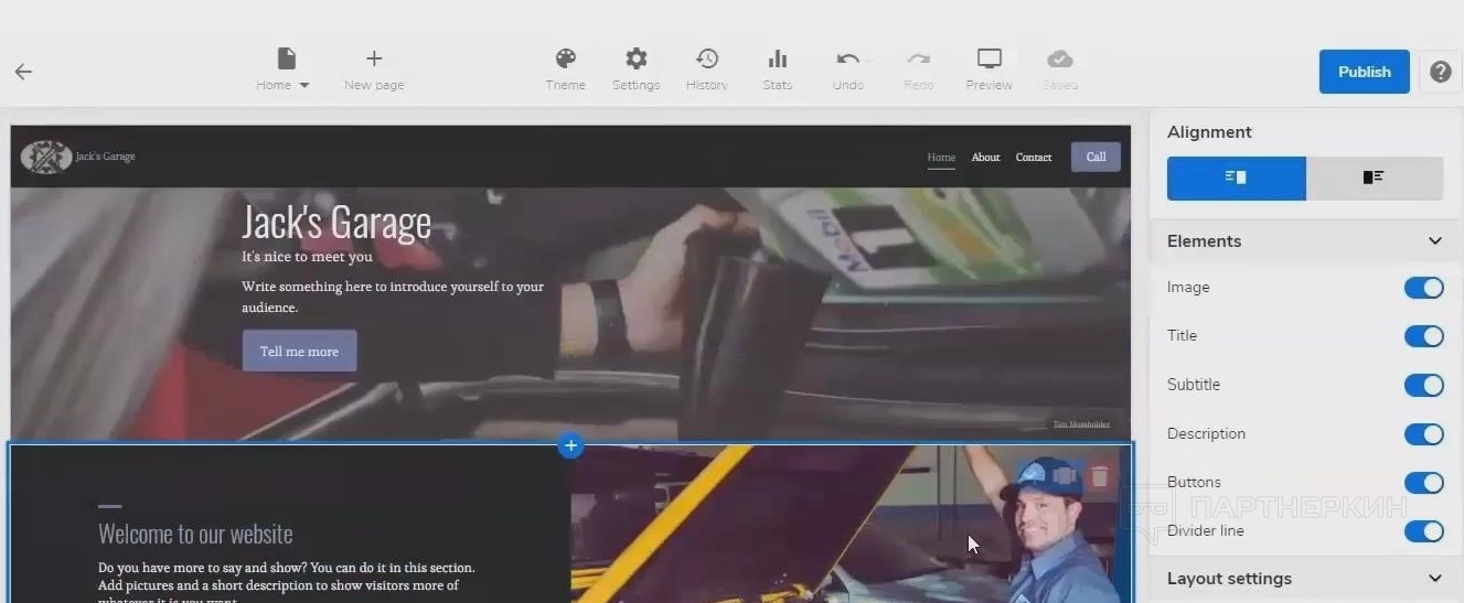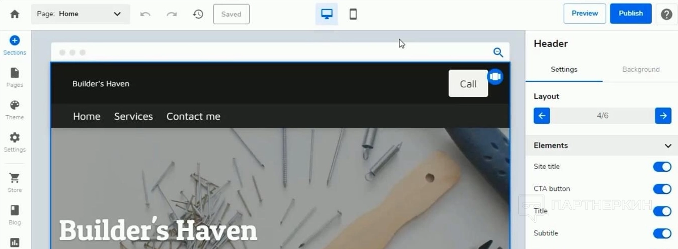 Финальные этапы – выбор навигации и стиля хедера и добавление контактной информации для страницы связи. После этого сайт станет доступен для предпросмотра, где можно внести последние правки: включить и отключить функции, изменить расположение блоков. Чтобы опубликовать проект, нажмите Publish в верхнем правом углу экрана.