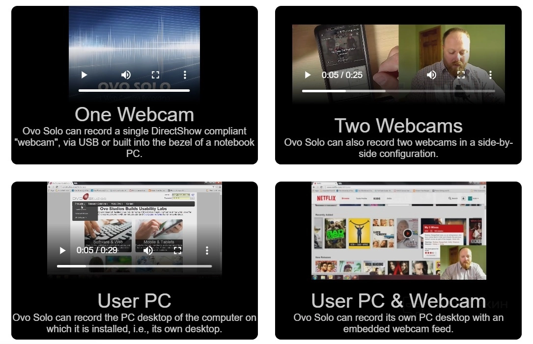 Ovo Soloможет записывать 1 камеру, совместимую с DirectShow, через USB или встроенную в лицевую панель ноутбука.