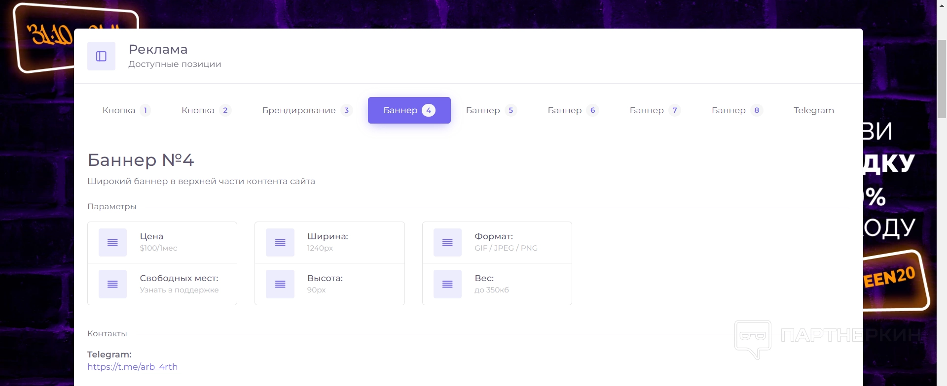 Раздел Реклама предназначен для рекламодателей и предлагает возможность размещать рекламные кампании прямо на сайте сервиса. Здесь достаточно выбрать, где именно хочется разместить рекламу — кнопка, баннер или Телеграм, например. Расценки расписаны в каждом пункте, а также отмечено число свободных мест.
