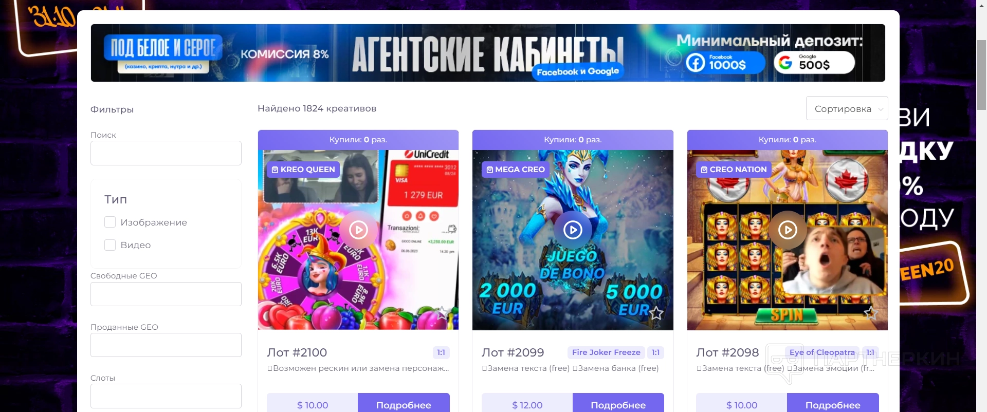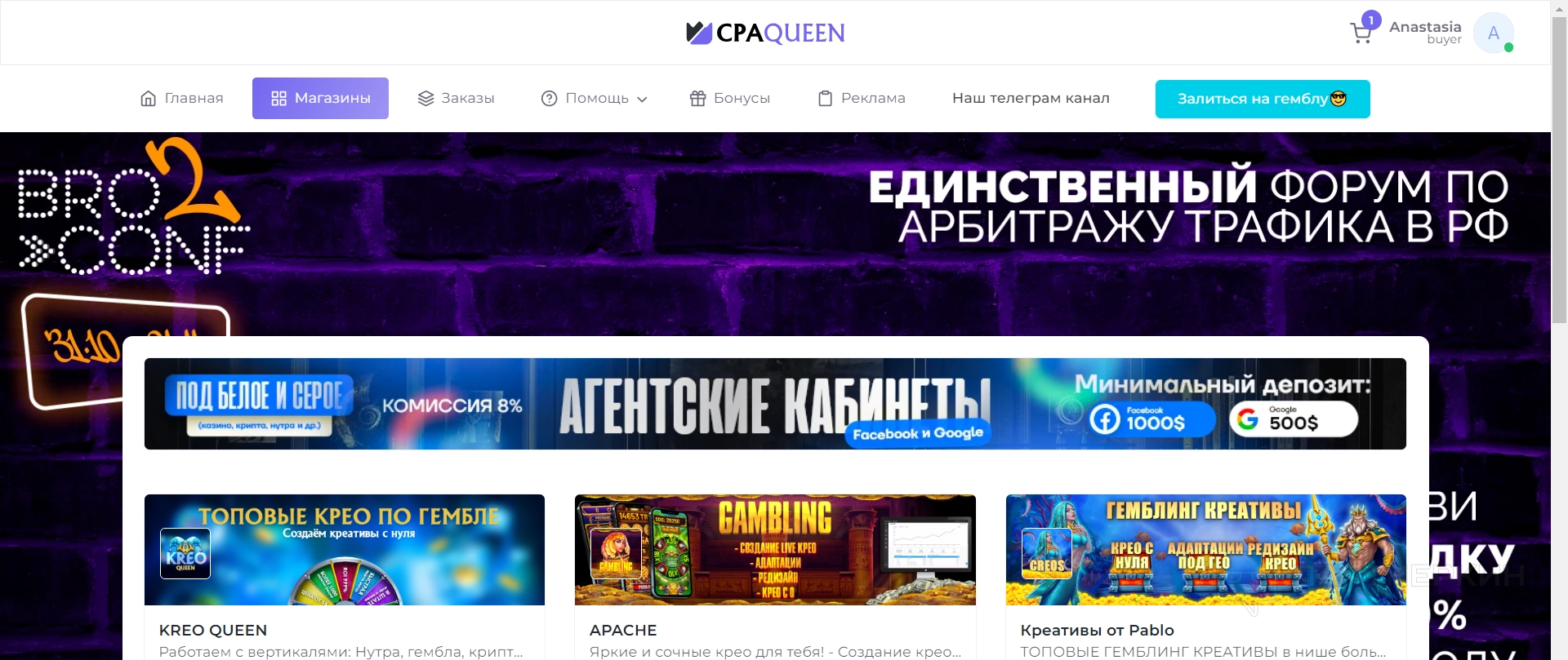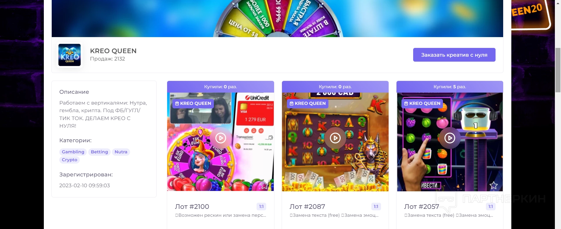 Покупка креативов на сервисе CPA Queen
