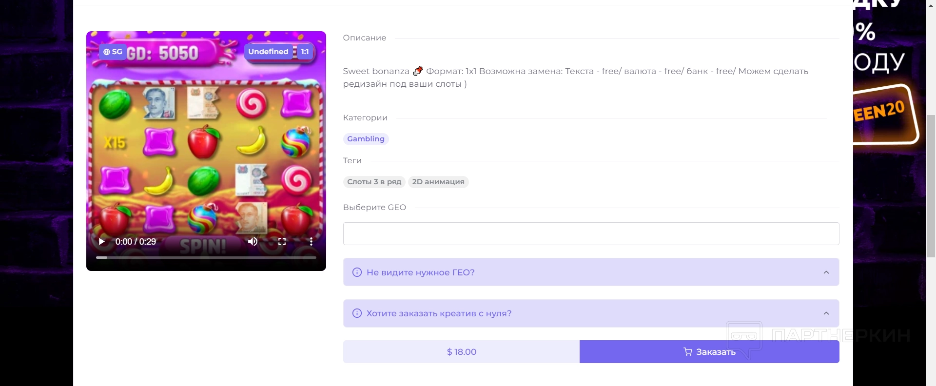 - Укажите географическую зону, в которой планируете использовать креатив, и нажмите на кнопку Заказать. Это поможет вам выбрать креативы, которые подходят для вашей целевой аудитории и рынка.