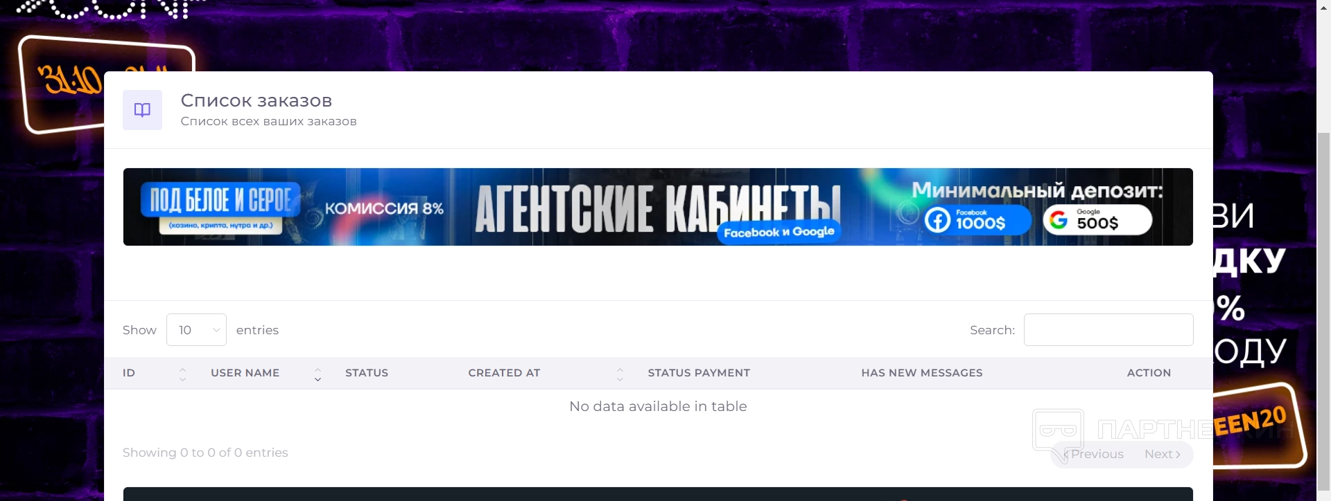 В этом разделе пользователи могут просматривать все свои заказы на платформе. Представлено все в виде таблицы, в которой пользователи могут просмотреть название услуги, ее статус и другие данные.