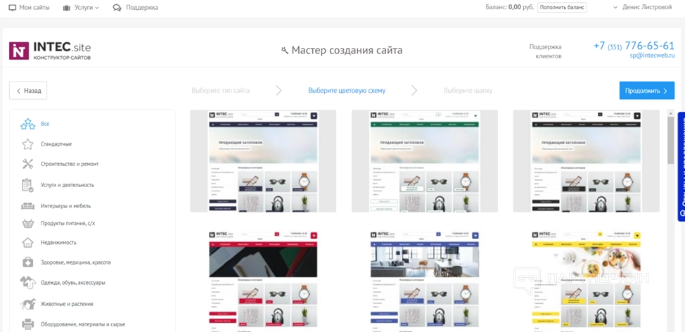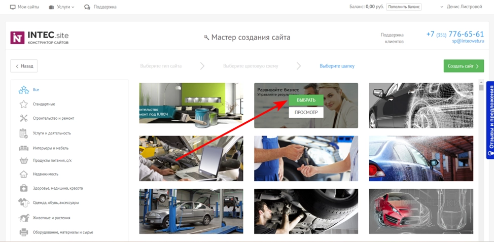 - Появится список шаблонов. Выберите подходящую категорию из списка: тип сайта, цветовую палитру и шапку.
