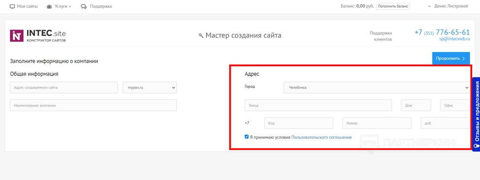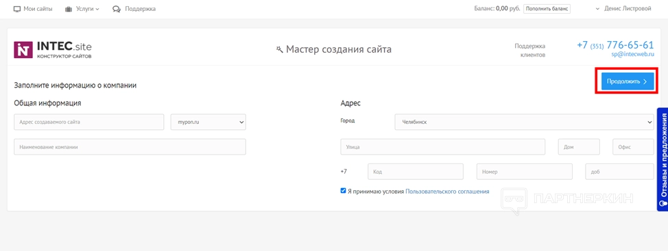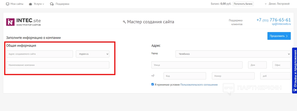 - Заполните информацию о компании: укажите адрес создаваемого сайта, выберите домен и добавьте наименование компании.