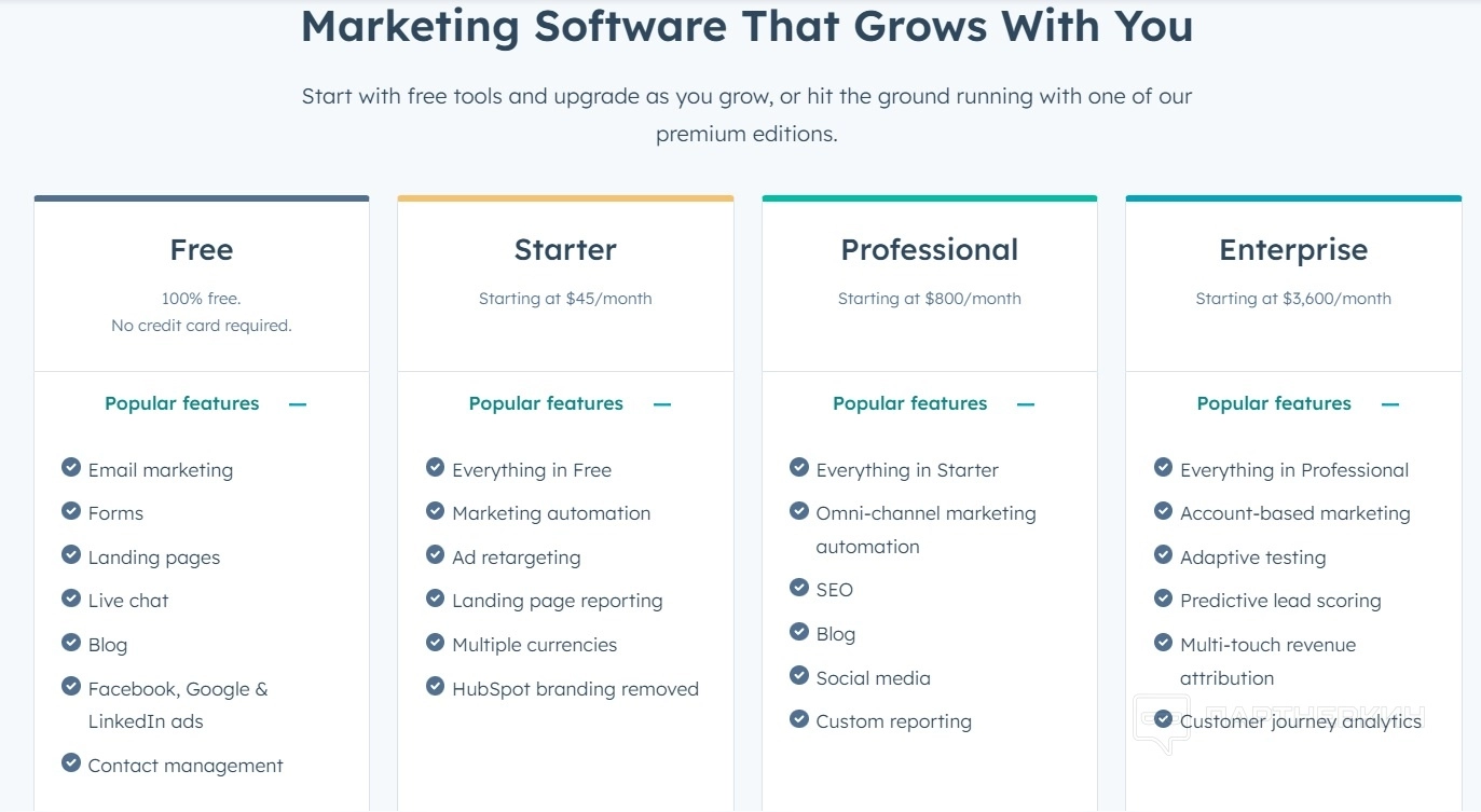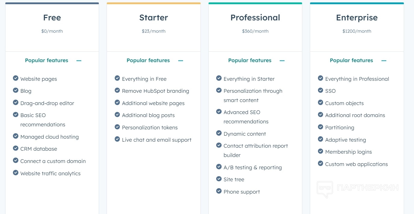 • Профессиональный — от $360/месяц, включает функции тарифа Стартер, плюс персонализация с помощью смарт-контента, расширенные SEO-рекомендации, динамический контент, конструктор отчетов по атрибуции контактов, A/B-тестирование и отчетность, дерево сайта, поддержка по телефону.