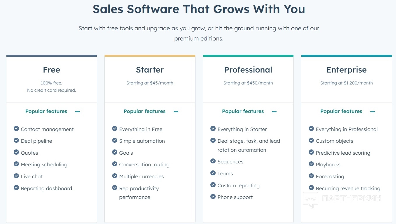 • Предприятие — от $1 200/месяц, включает функции на тарифе Профессиональный, плюс пользовательские объекты, предиктивная оценка лидов, плейбуки, прогнозирование, периодическое отслеживание доходов.