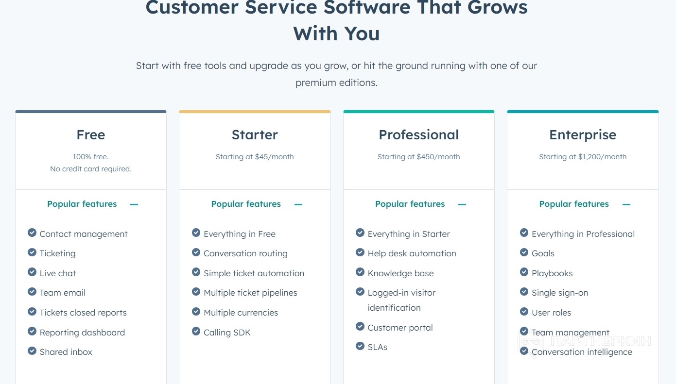 • Профессиональный — от $450/месяц. Входят функции на тарифе Стартер, плюс автоматизация службы поддержки, база знаний, идентификация авторизованного посетителя, портал клиентов, SLA.