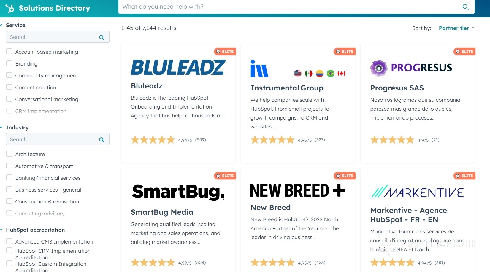 Среди партнеров, которых можно найти — агентства по адаптации и внедрению HubSpot, маркетинговые компании, поставщики решений для корпоративного маркетинга, продаж и обслуживания, технические партнеры, консалтинговые компании. Партнеров, представленных в каталоге,