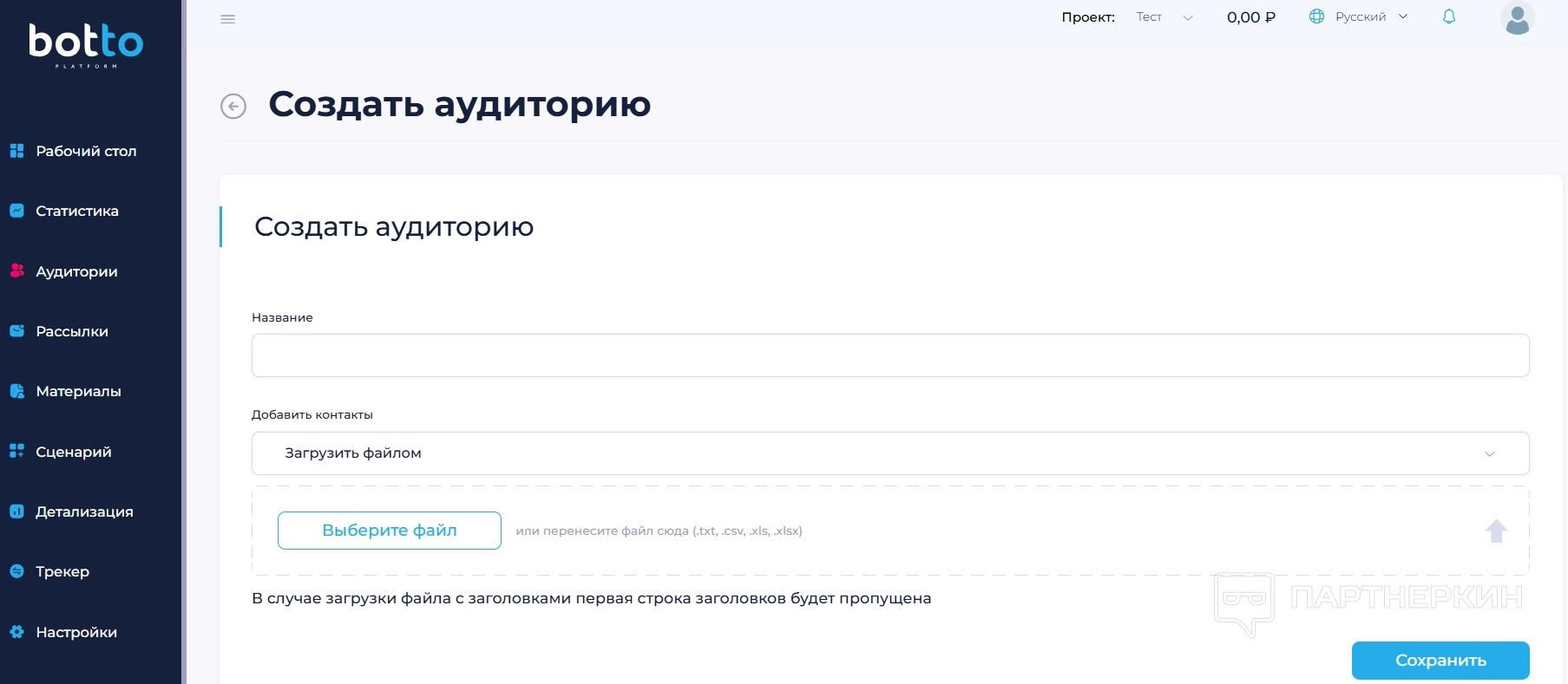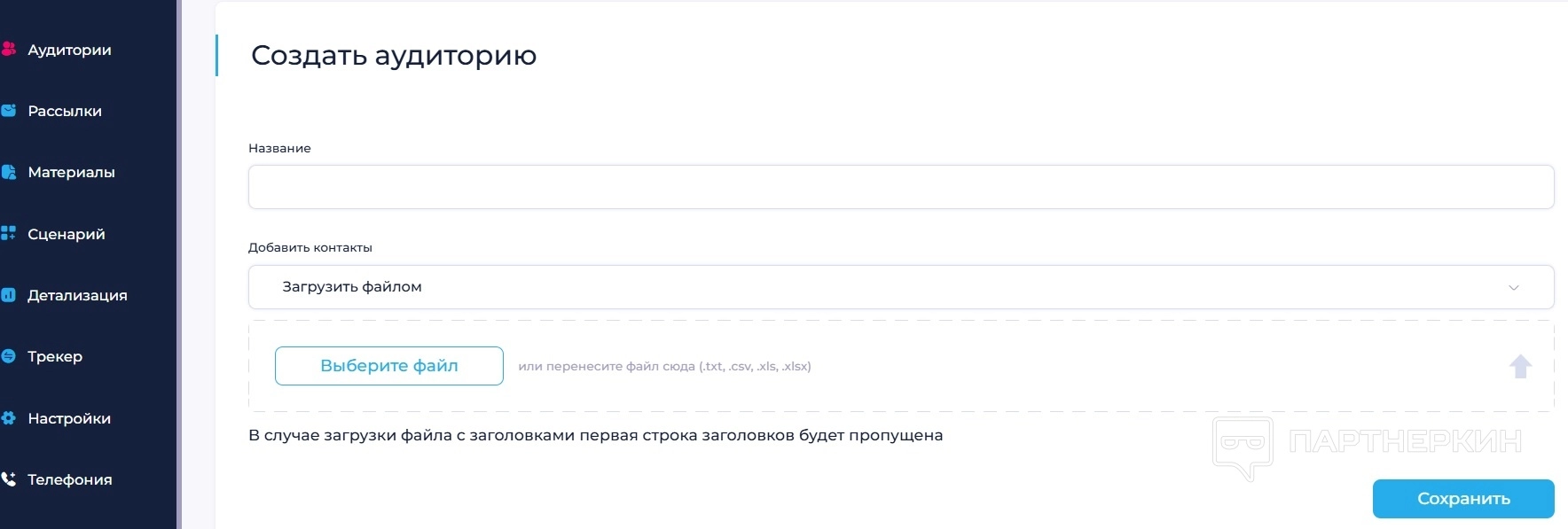 - В личном кабинете перейдите в раздел «Аудитории». Здесь можно создать новую аудиторию или выбрать уже загруженную. Можно загрузить файл с контактами или перенести список в специальное окно.