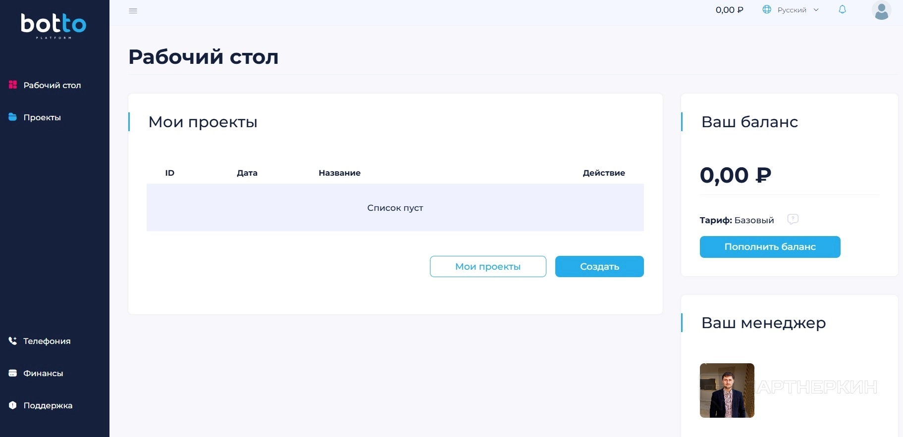- Запуск. После настройки проекта можно запустить его, используя возможности умного робота Botto Platform. Робот автоматизирует маркетинговые задачи, обеспечивая эффективное привлечение и обработку клиентов.