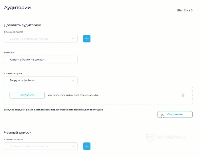 - На этапе «Аудитории» загрузите список контактов в форматах .csv, .txt, .xls, .xlsx или в виде списка с разделителем запятая. Используйте черные списки для исключения ненужных контактов.