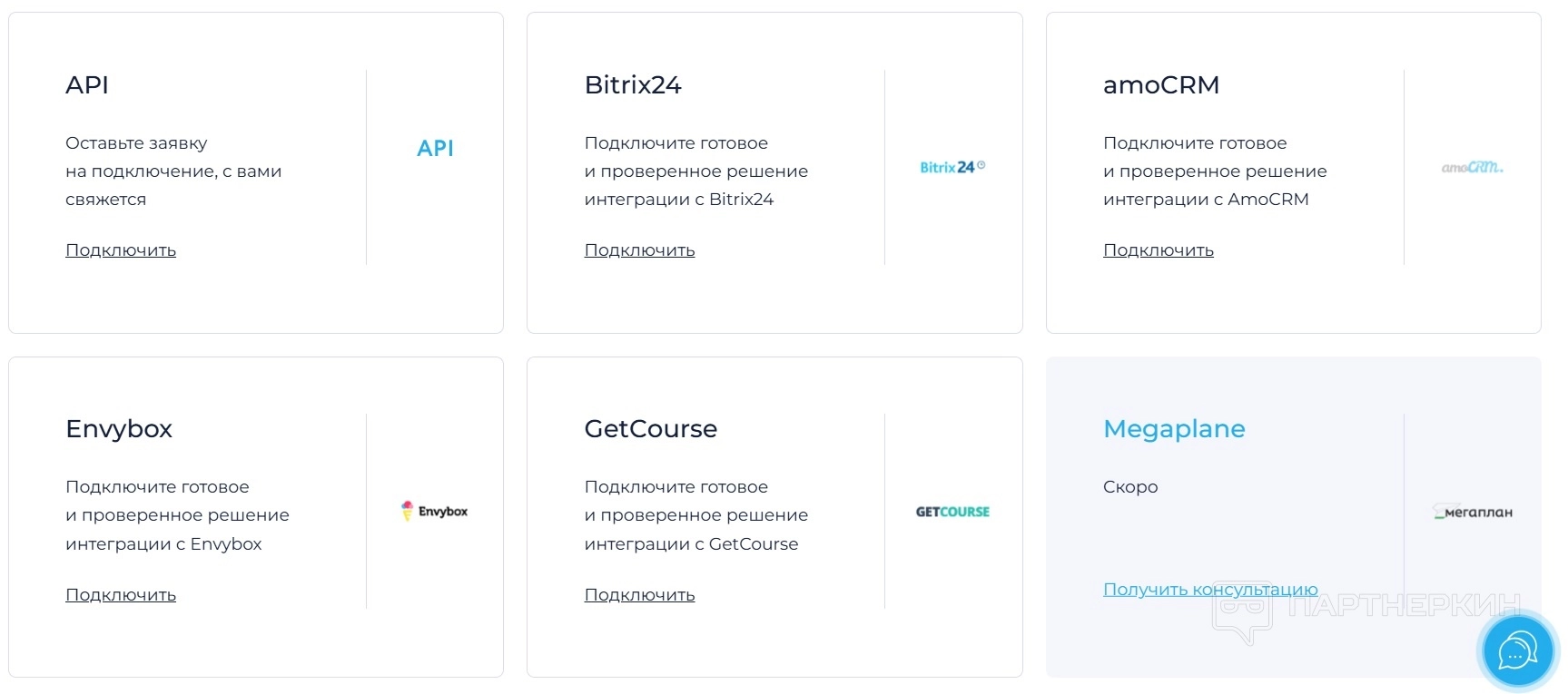 - Интеграции с CRM: Bitrix24, amoCRM, Envybox, GetCourse, Megaplane, RetailCRM, 1C, PROSTOY. Для настройки интеграции достаточно перейти в раздел «Настройки» на вкладку «Интеграции» и создать новую интеграцию, используя виджет или шаблоны, предоставленные платформой. Подробная документация поможет вам быстро и без проблем подключить необходимые системы.