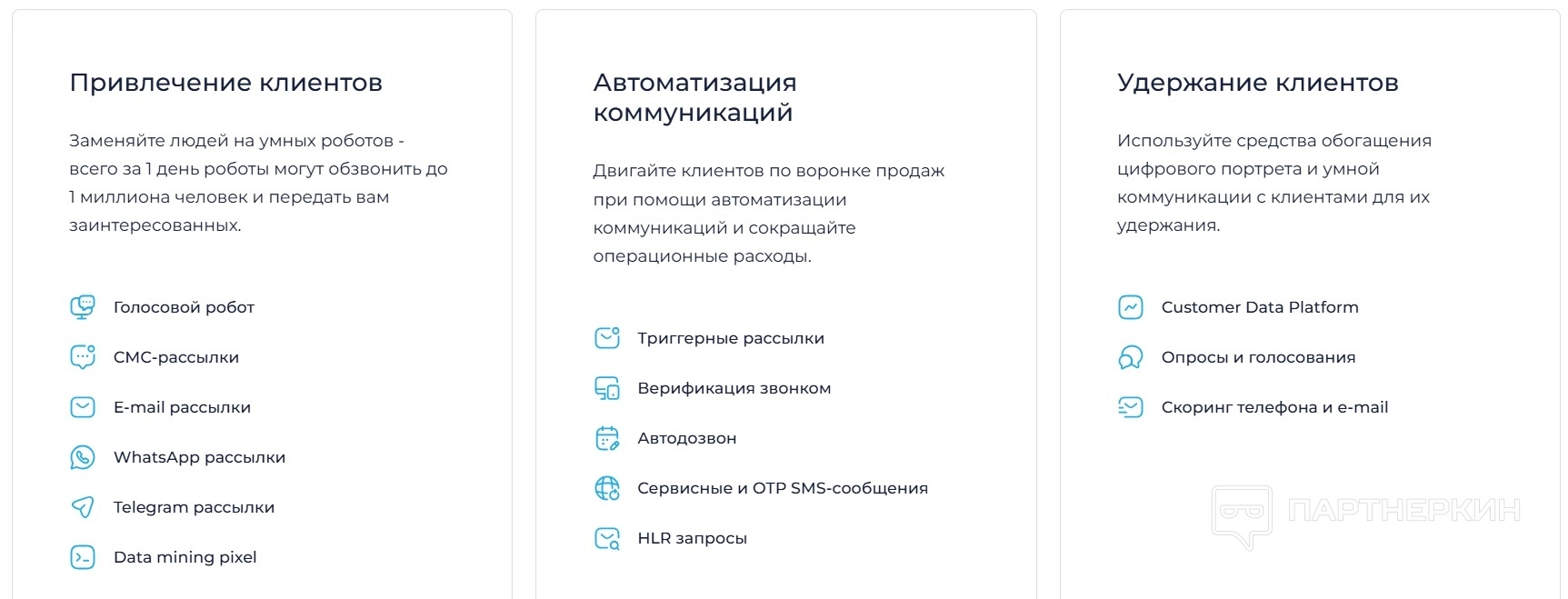 - Голосовые рассылки. Сервис позволяет обзванивать до 1 млн. номеров в день с распознаванием речи.