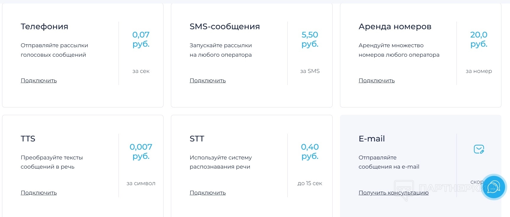 - Телефония. Рассылки голосовых сообщений доступны по цене 0,07 руб. за секунду.