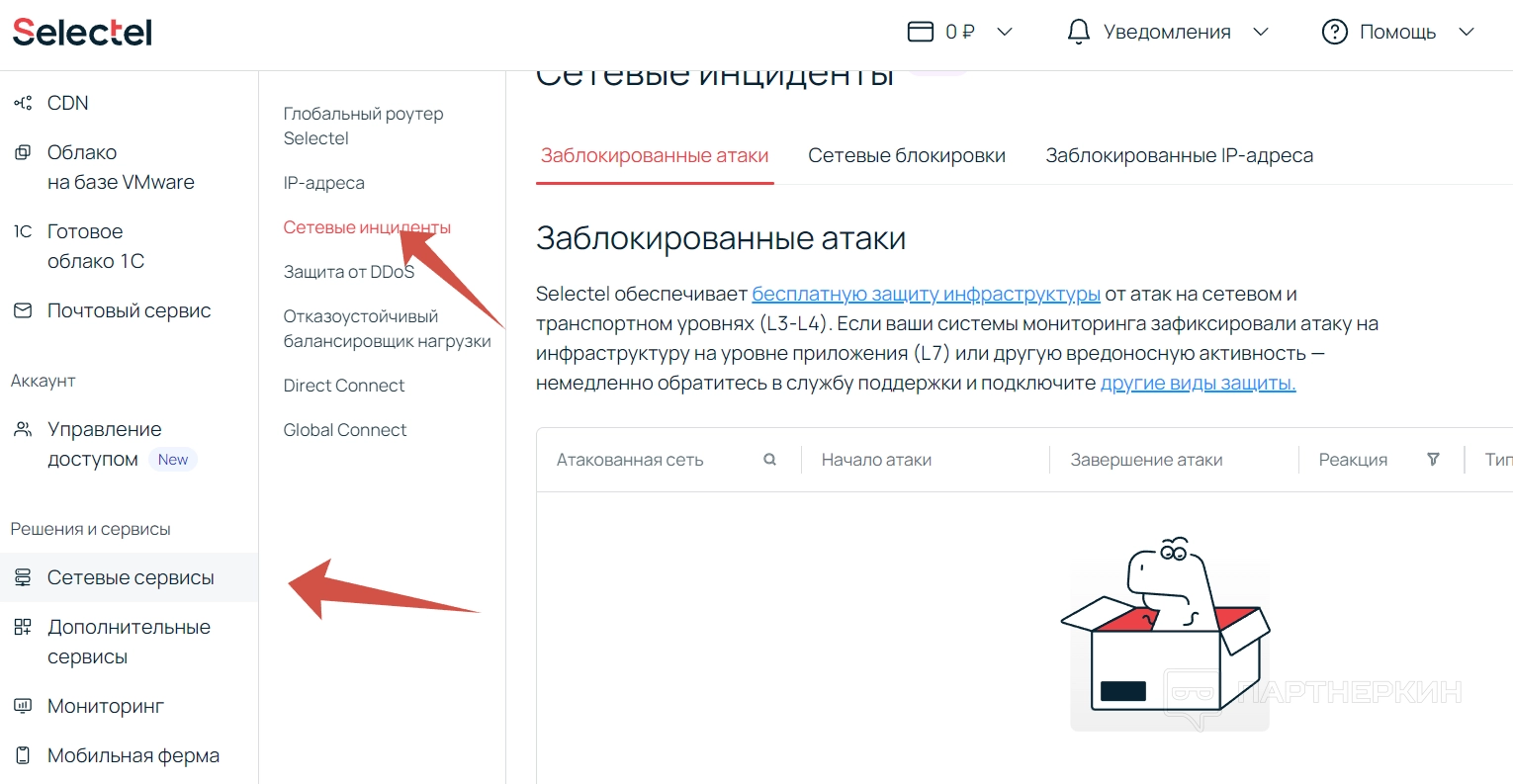 - Сетевые инциденты – здесь есть таблица, в которой будут храниться сведения по заблокированным атакам, сетевым блокировкам и забаненным IP-адресам. Проще говоря, отчеты по системе защиты Selectel.