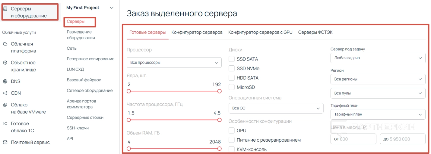 Это основной раздел сервиса, в котором вы можете заказать сервер или оборудование. Главные вкладки – «Серверы». Здесь вы увидите все предложения сервиса по готовым и индивидуальным серверам.