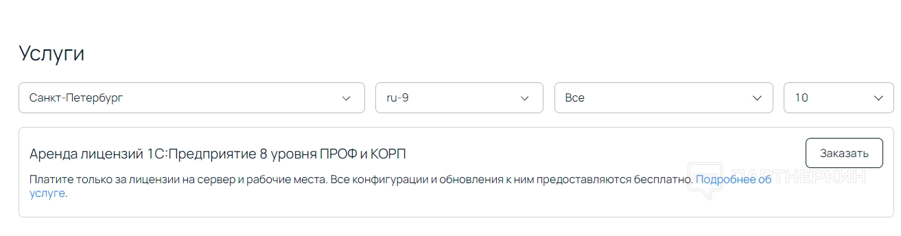- Услуги – здесь можно взять в аренду лицензию 1С: Предприятие.