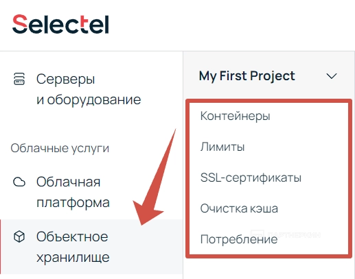 Далее идет вкладка «Объектное хранилище», предоставляются доступ в инструментам настройки дискового пространства. Какие вкладки вы здесь найдете: