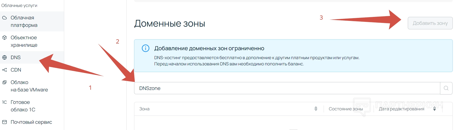 Следующая вкладка – «DNS». Здесь вы можете добавить доменную зону. Для этого переходим в соответствующую вкладку, в указанную строку вписываем название и жмем на кнопку «Добавления». Однако для начала нужно пополнить баланс. Все добавленные DNS будут отображаться в специальной таблице.