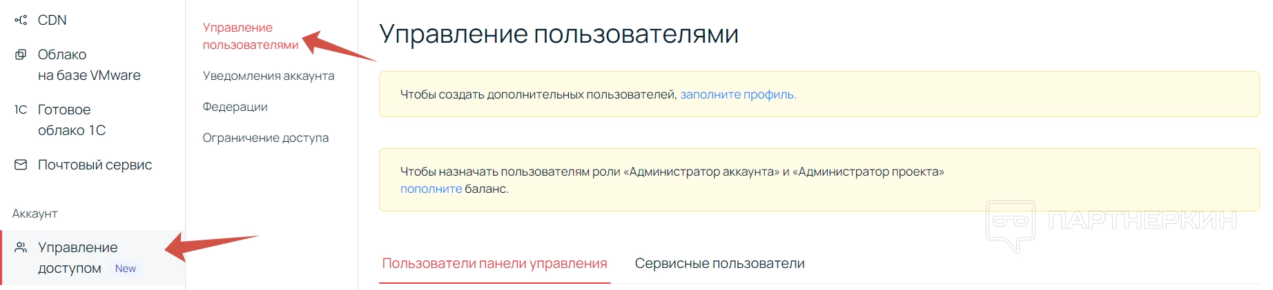 - Управление пользователями – здесь вы можете выдавать доступ к аккаунту другим пользователям. Для этого достаточно указать электронную почту и логин. Все данные будут отображаться в таблице.