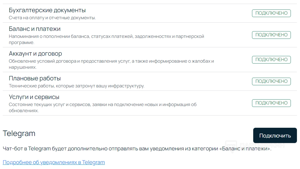- Уведомления аккаунта – здесь можно включить уведомления, касающиеся бухгалтерских документов, баланса и платежей, аккаунта и договоров, плановых работ, а также услуг и прочих сервисов. Еще есть возможность подключить Telegram-бота.