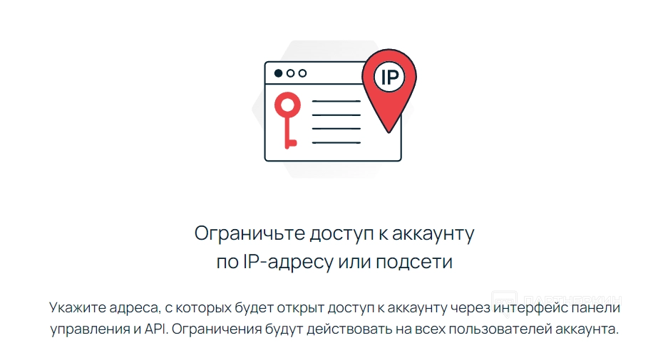 - Ограничение доступа – ограничения можно накладывать по IP-адресу или подсети. Они будут действовать на всех пользователей, у которых есть доступ к учетной записи.