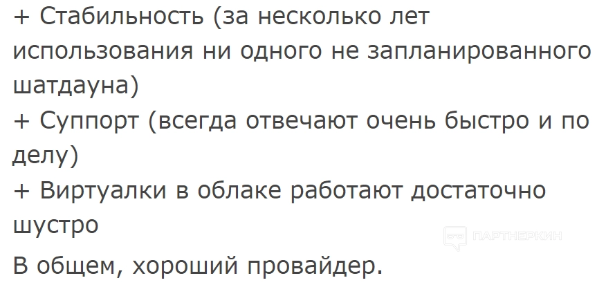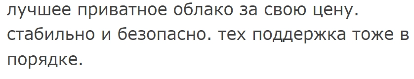 Еще пользователи довольны стабильность и безопасность приватного облака. Также отмечается выгодная стоимость услуг.