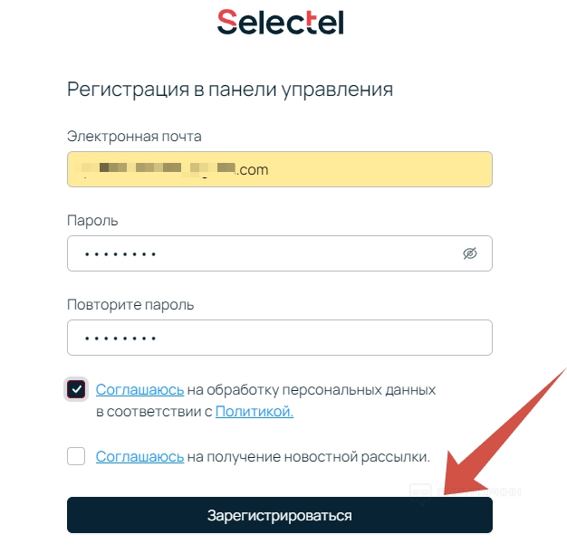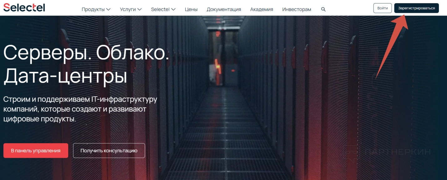 Для получения доступа к функционалу вам нужно зарегистрировать учетную запись. Для этого открываем главную страницу Selectel и кликаем на соответствующую кнопку в верхнем правом углу.