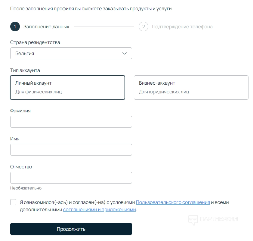 По завершении вы попадете на страницу сервиса, где нужно будет заполнить анкету. В форме указываем свою страну, тип аккаунта (личный или бизнес), а также фамилию, имя и отчество. В конце соглашаемся с условиями пользования и сохраняем анкету. НА второй странице нужно будет указать телефон, после чего на него придет смс с кодом подтверждения учетной записи.