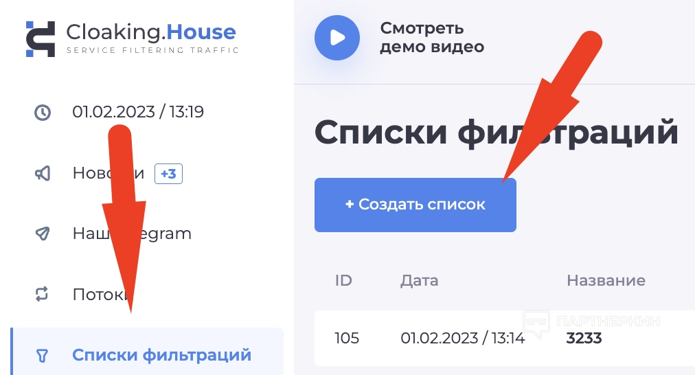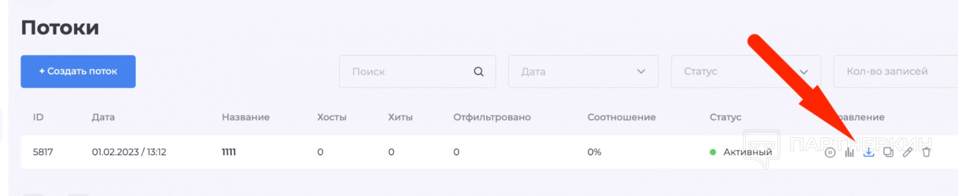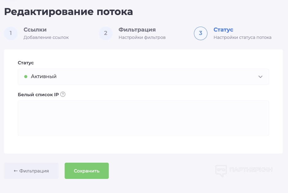 В конце нужно переключить статус потока в активный режим и указать белый список IP-адресов. Например, свой, чтобы быстро заходить на страницу оффера: