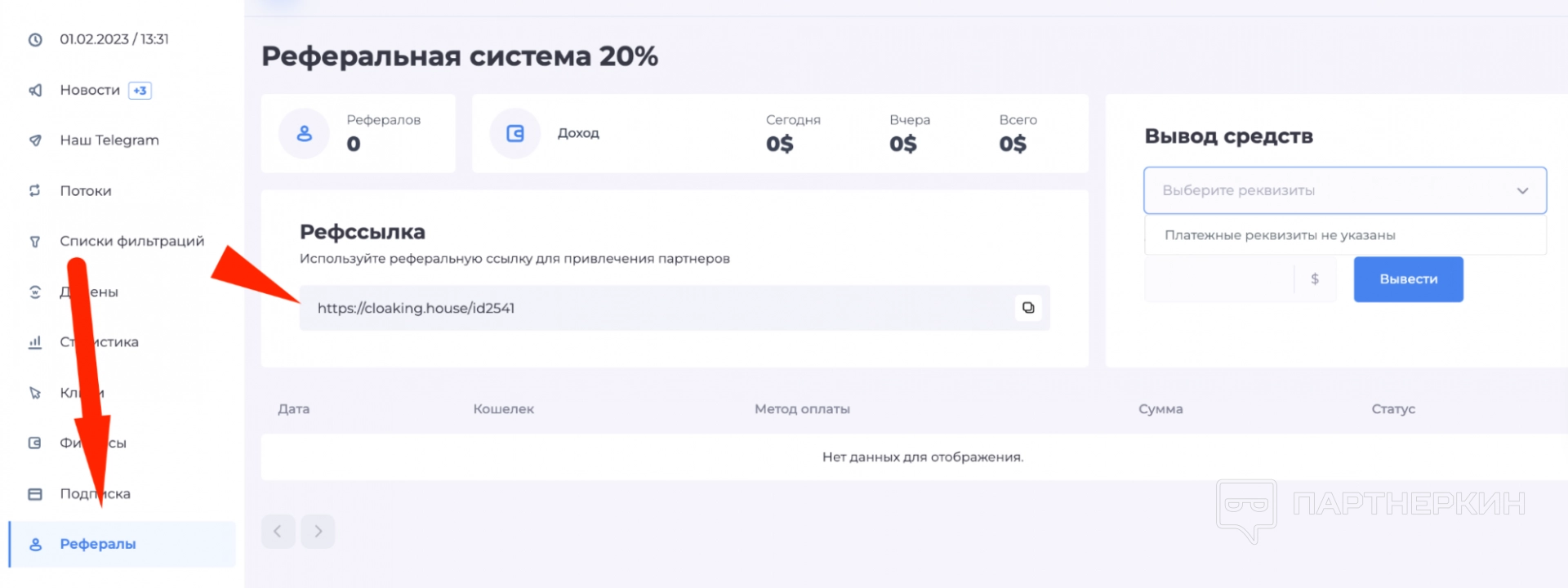 В разделе «Рефералы» уже ждет ссылка, по которой можно получать 20% за каждого приведенного клиента: