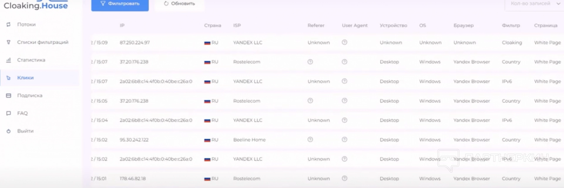 В разделе «Клики» можно увидеть информацию по каждому клику. Включая данные, из какого гео он пришел, попал ли на блэк и какой фильтр отправил на вайт: