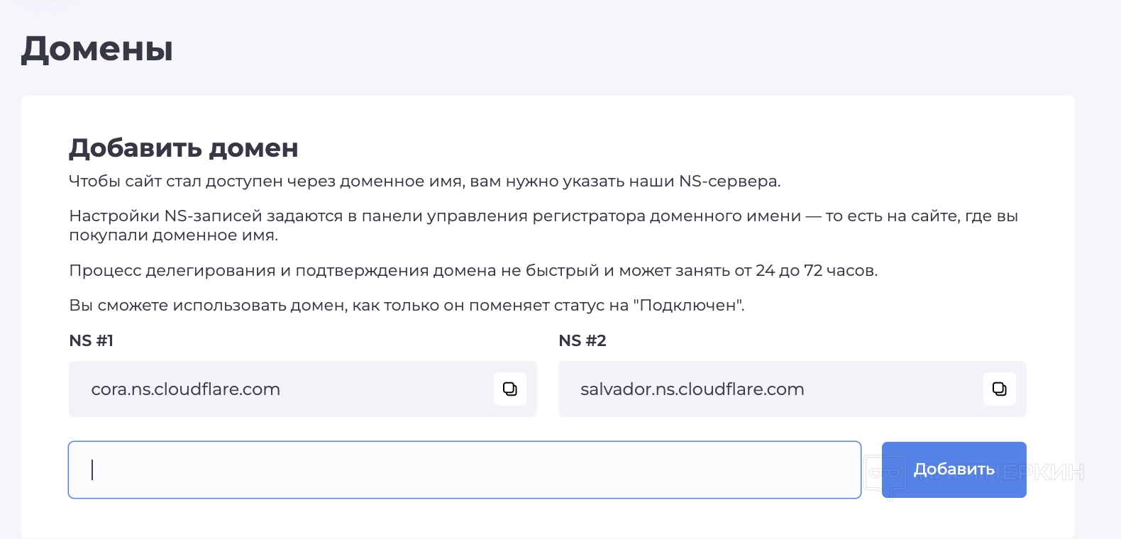 Если нужно использовать свой домен, можно привязать его в разделе «Домены». Добавляется адрес домена, а также копируются NS1, NS2, которые нужно вставить в своем регистраторе доменов:
