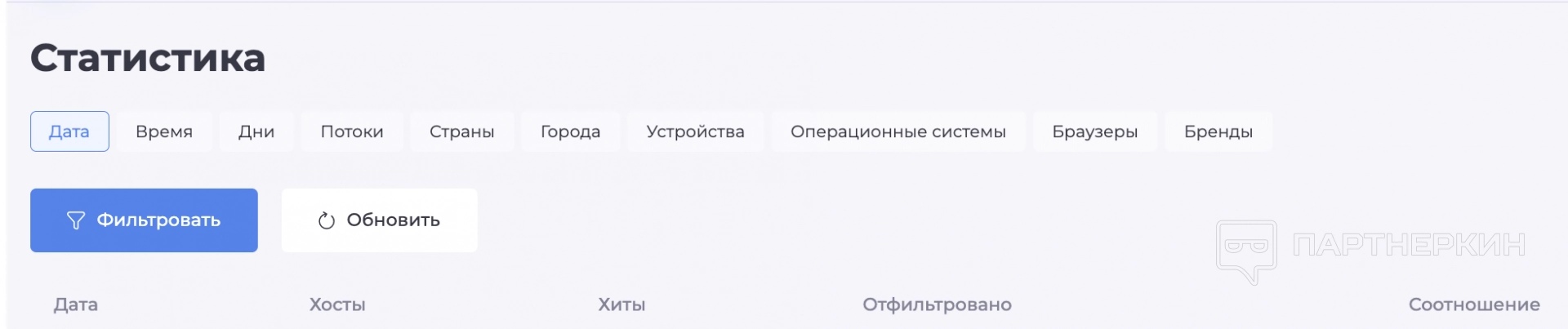 В разделе «Статистика» можно смотреть информацию с разбивкой по дате или потоку. Включая количество кликов, страны, ОС, браузеры, количество отфильтрованных кликов и их соотношение к тем, что прошли на black page: