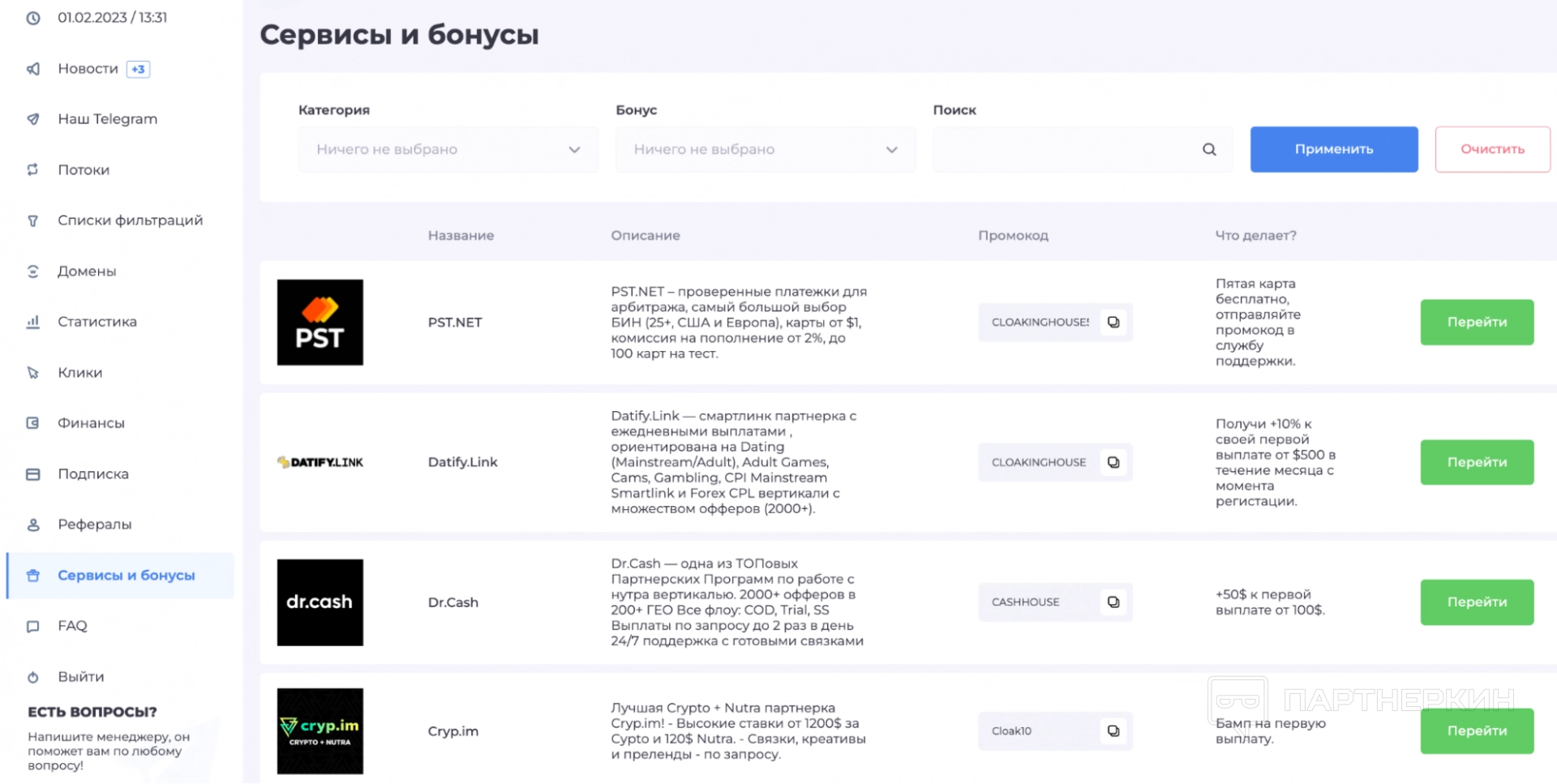 В блоке «Сервисы и бонусы» можно получить скидки на массу полезных для арбитражников сервисов: