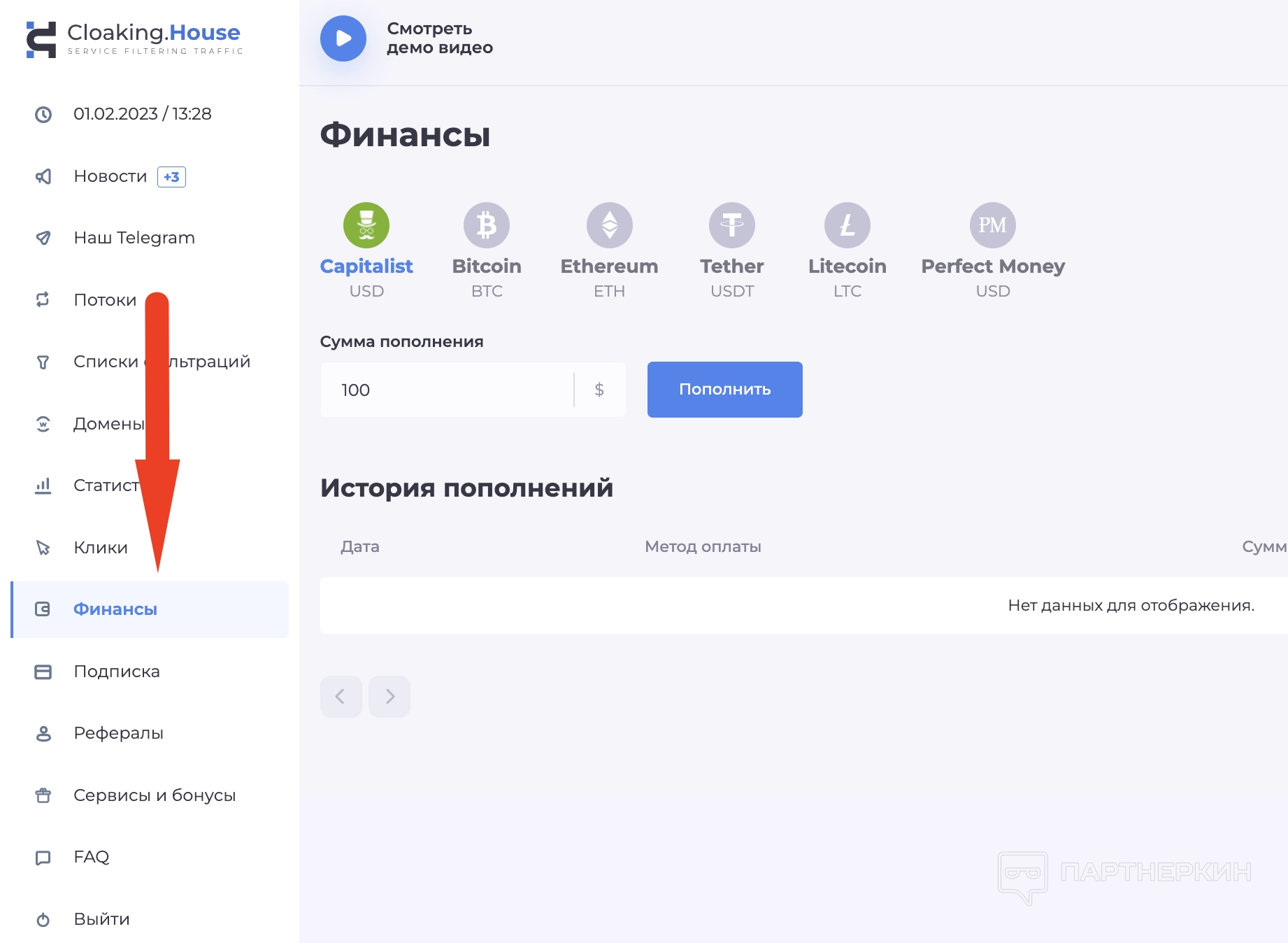Пополнить счет можно в разделе «Финансы». Доступны платежные системы: