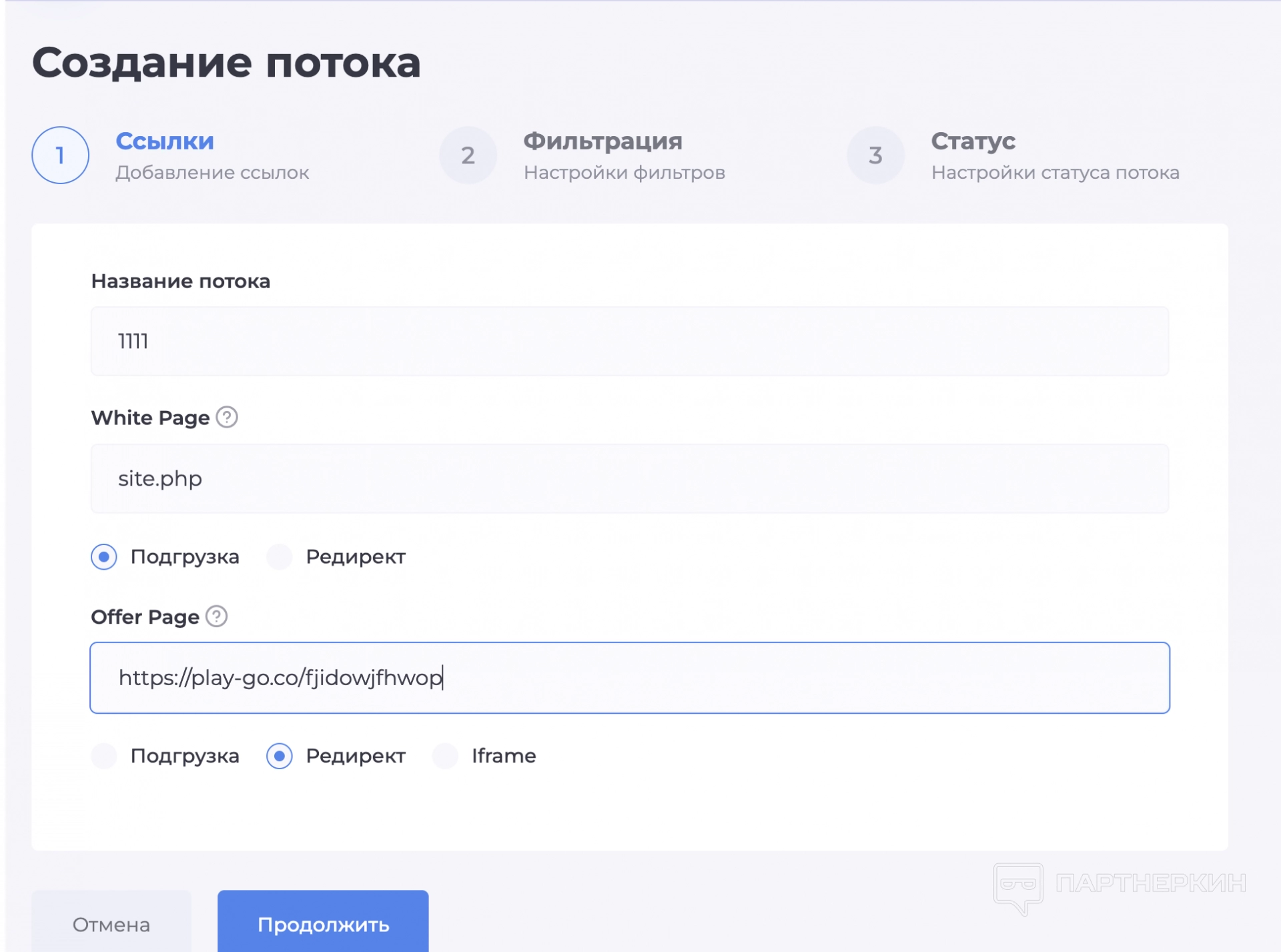 Однако от типа регистрации будут зависеть настройки потока. В частности, подтягиваются вайты и блэки через редирект или подгрузку.
