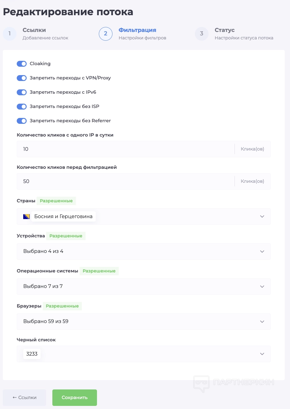 Во втором окне можно работать с фильтрами. Базовые фильтры включены по умолчанию, лучше оставлять их все. Количество кликов с одного IP в сутки укажет лимит по кликам, после достижения которого юзер в любом случае будет отправлен на вайт. В поле «Количество кликов перед фильтрацией» указывается, сколько первых кликов после создания потока улетят на вайт. Далее нужно выбрать разрешенные страны, устройства, операционные системы, браузеры и черный список, если он предварительно создан.