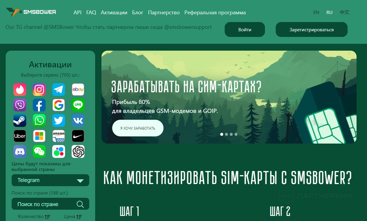 А для владельцев сим-карт доступна доходная партнерская программа: сдавайте ваши симки в аренду и получайте от 80% с продаж смс по вашим номерам.
