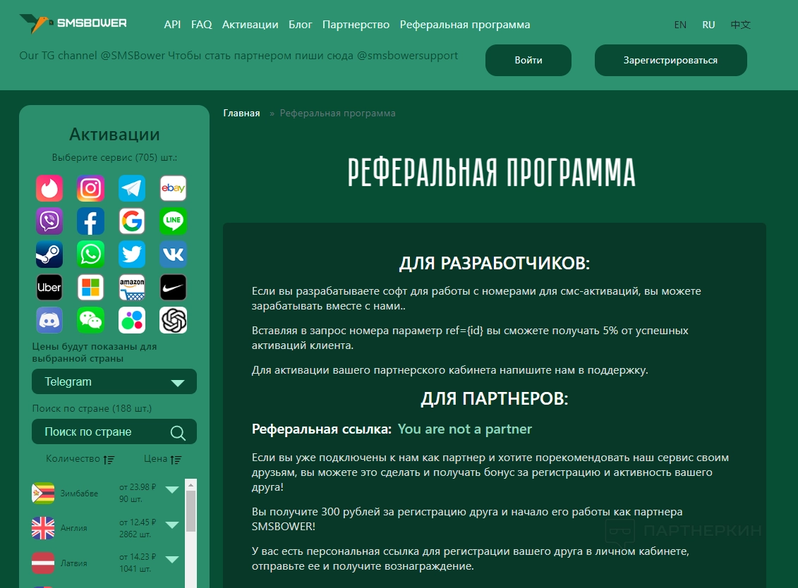 - для арбитражников и веб-мастеров (размещение идентифицированных ссылок на смс-активатор на ресурсах арбитражников, доход — 5% от оборота с покупок по ссылкам).
