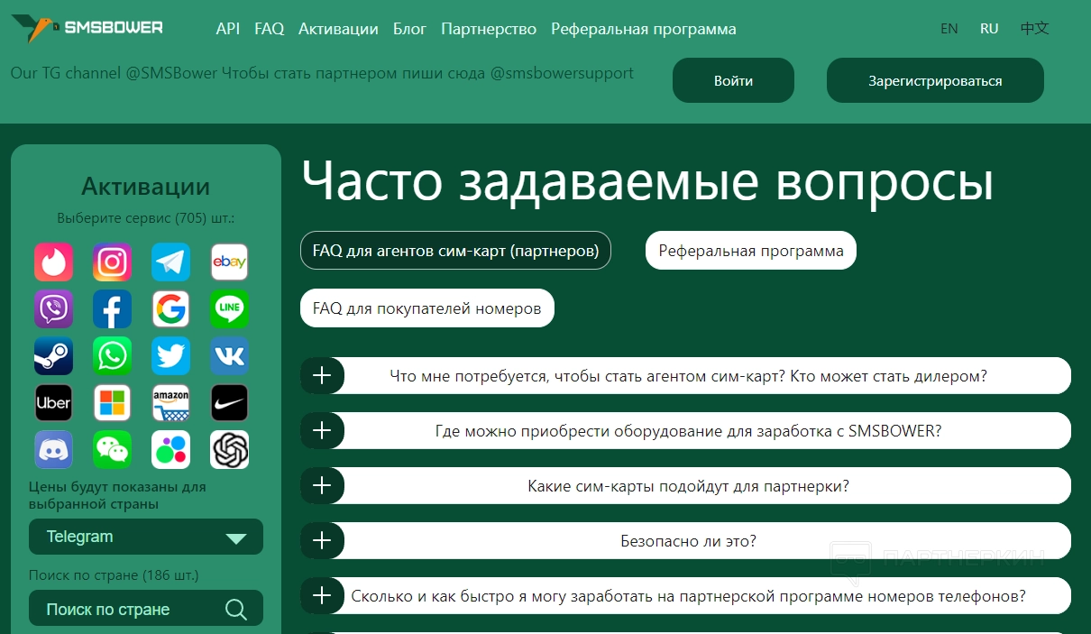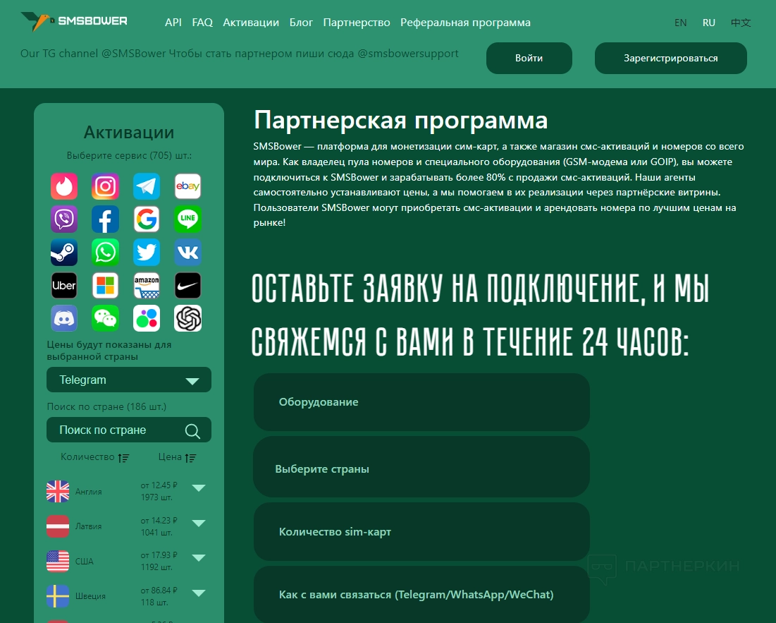 Здесь размещена форма для заявки на подключение к партнерской программе для владельцем сим-карт. Суть партнерки: если у вас есть много неиспользованных симок и специальное оборудование (или возможность его приобрести, с чем, кстати, на сайте обещают помочь в плане совета по выбору) и компьютер с доступом к Интернету, то можно организовать себе пассивный доход в виде сдачи в аренду своих номеров для нужд смс-активации. Заявлено, что партнеры получают от 80% с дохода от смс-активаций, уровень заработка зависит от количества сим-карт и стран операторов, их выпустивших.