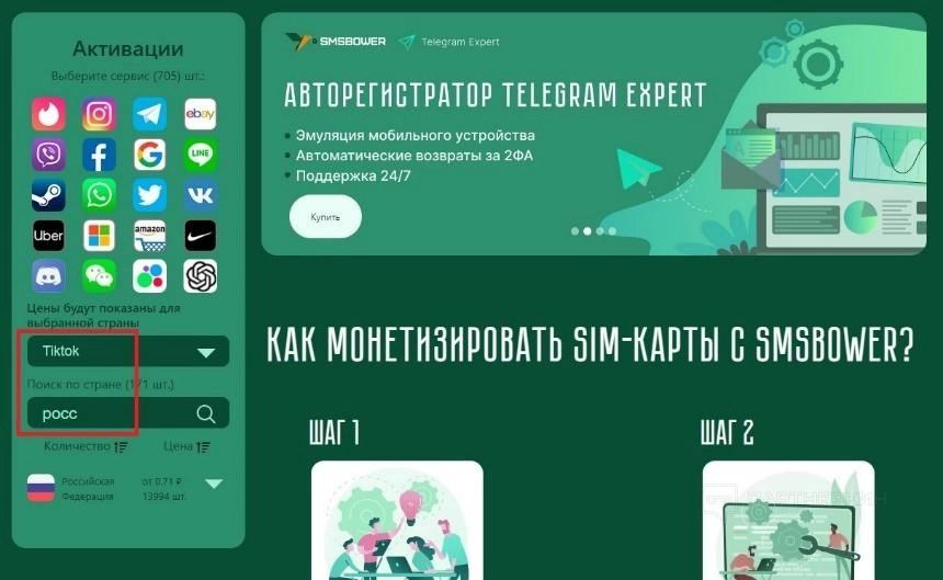 - Выбор параметров приобретаемого номера — указываем площадку для регистрации нового аккаунта и страну телефонного оператора.