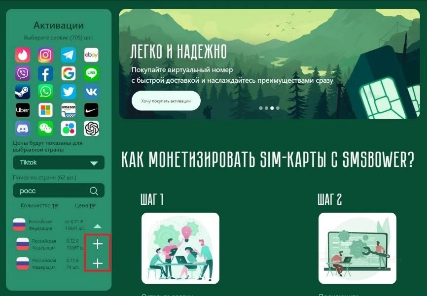 - область выбора параметров услуг (сервис для регистрации аккаунта, страна мобильного оператора) слева;