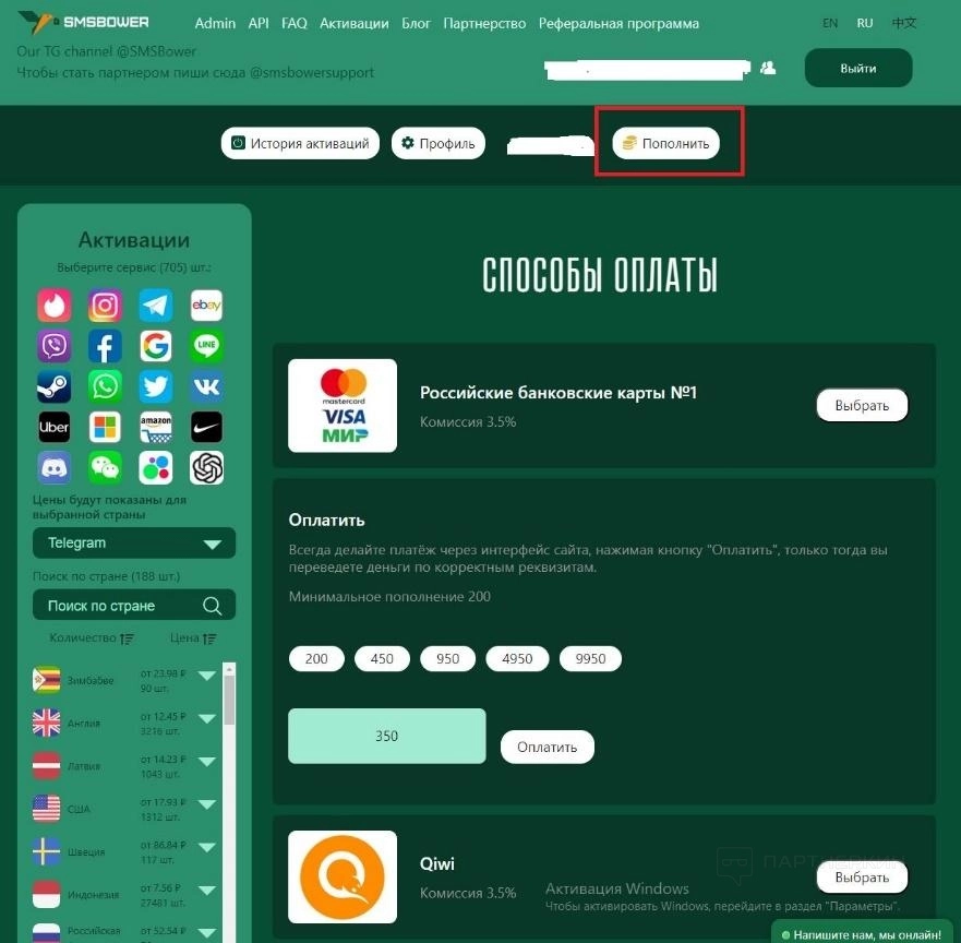 - Пополнение счета. На предыдущем этапе мы узнали, сколько стоит номер. Теперь для его покупки нужно пополнить баланс. Это можно сделать с помощью банковской карты, криптовалюты и даже электронных денег (типичный набор платежных средств, популярных в Интернете).