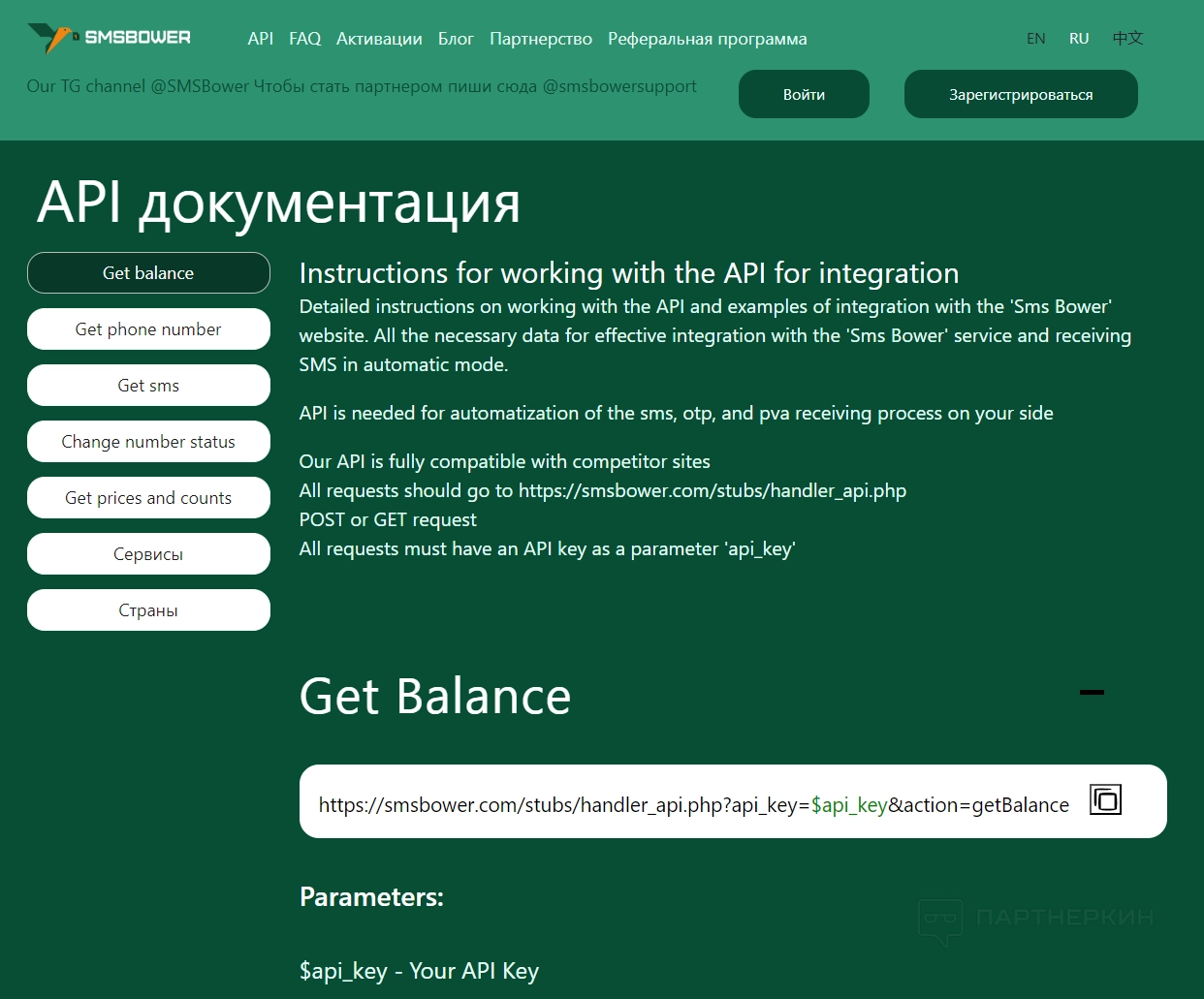 Раздел с основной информацией для подключения к программному интерфейсу. Эта возможность используется для автоматизации процессов взаимодействия с сайтом (сервисом). В данном случае здесь можно интегрировать смс-активатор в ваш сервис для автоматической закупки виртуальных номеров и тому подобное. Раздел еще не переведен на русский язык, но основная информация понятна ибо типична для подобных разделов: здесь приведены ссылки и их параметры для выполнения разнообразных команд в автоматическом режиме.