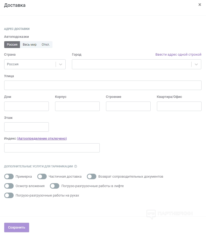 - Ввести город доставки и способы доставления товара. Для доставки курьером или почтой достаточно указать полный адрес и кликнуть «Сохранить».