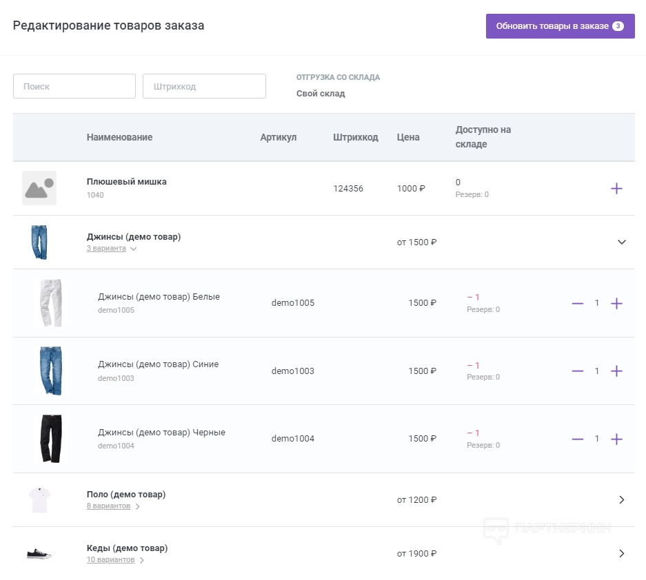 - Выбрать из списка необходимые позиции и проставить количество. Нажать «Обновить товары в заказе».